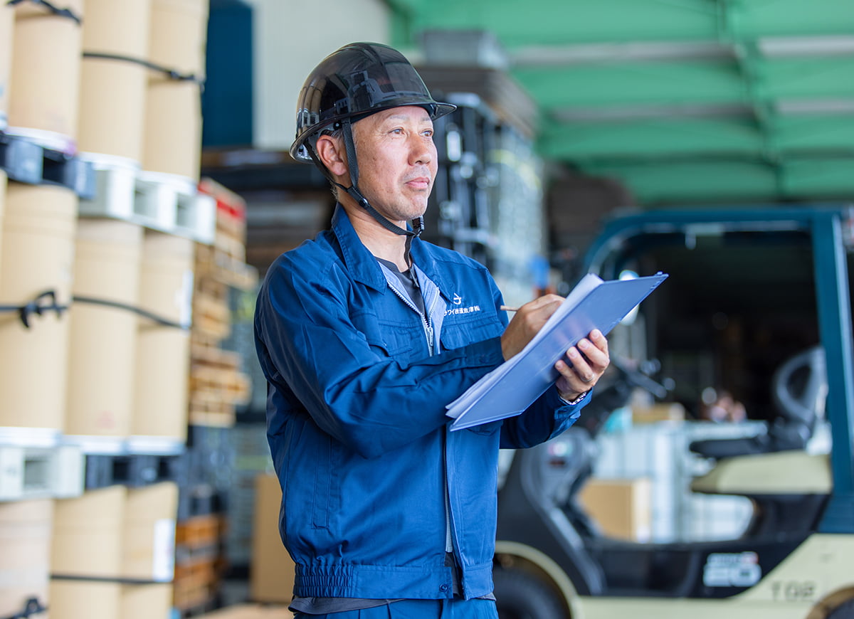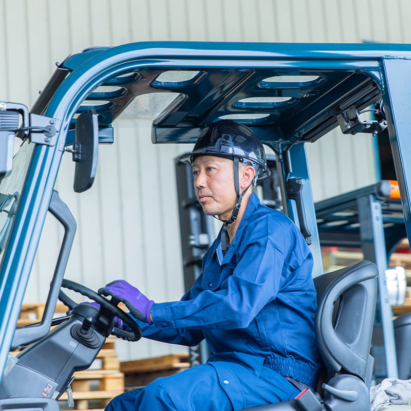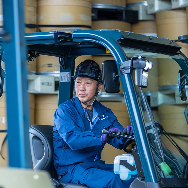工場と倉庫間での輸送業務およびフォークリフト作業、倉庫内での入出庫作業を行っています。シフト制で24時間稼働しているため、早朝や深夜の勤務もあります。